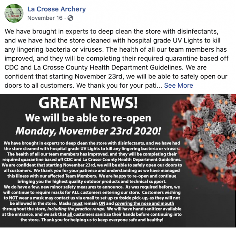 - Curbside Pickup: Archery Headquarters and La Crosse Archery offer curbside pickup, but said their customers seldom use it. Customers tell Phillips they appreciate the option even though they don’t use it.