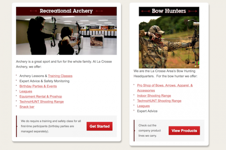 Many archery retailers, of course, want to appeal to bowhunters and recreational archers. Much like independent bookstores gaining an edge by specializing, archery retailers can establish themselves as experts by promoting their services and programming first, and product selection second. This approach appeals to a broad customer base. You can also create messaging for different audiences as long as you stay true to your core identity. One such retailer, La Crosse Archery in Wisconsin, structured its website with separate, clearly marked information for recreational archers and bowhunters.